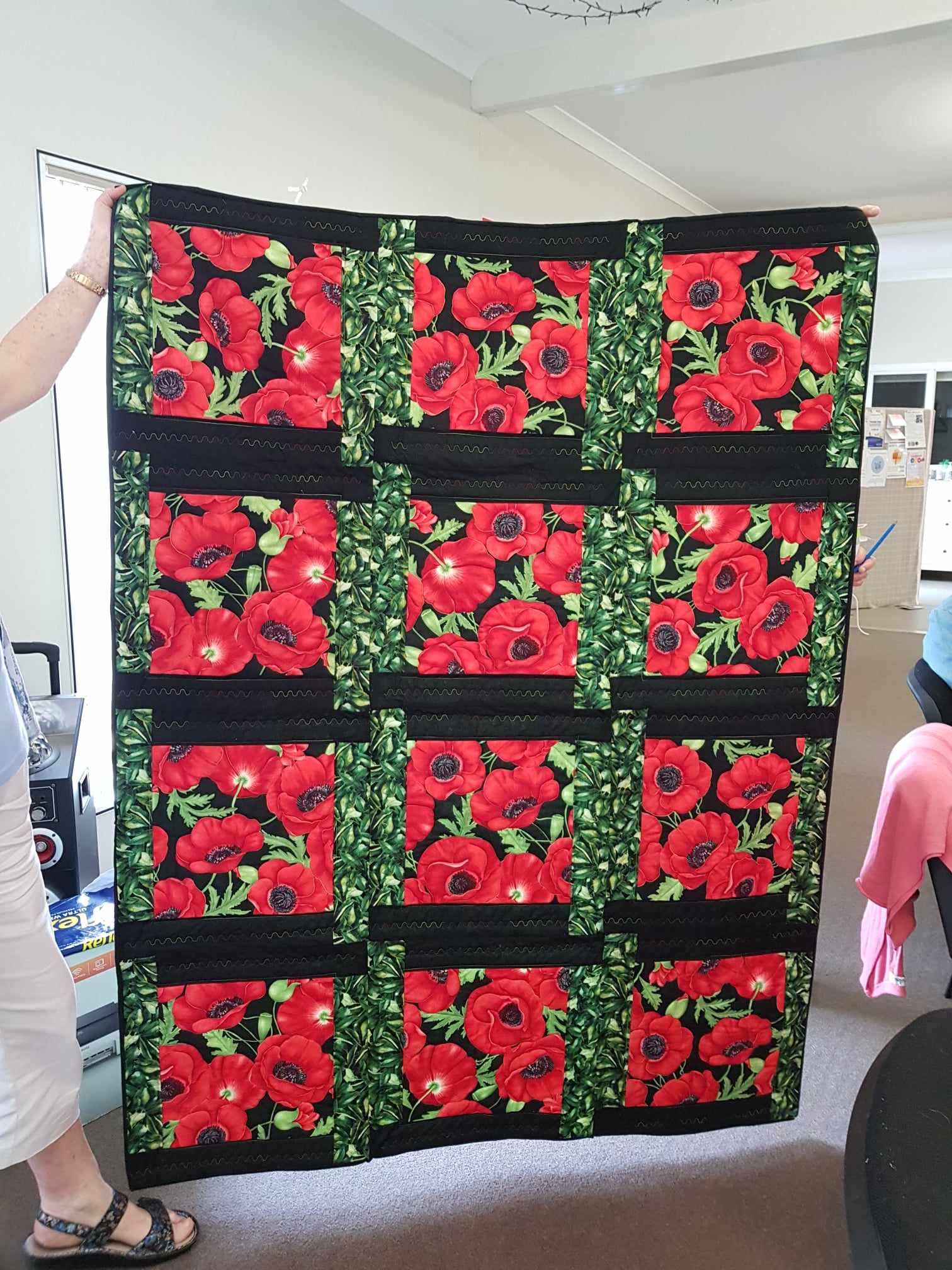 Note the decorative stitches using variegated thread in the sashings. Really interesting to offset the black sashings to give the quilt some movement.